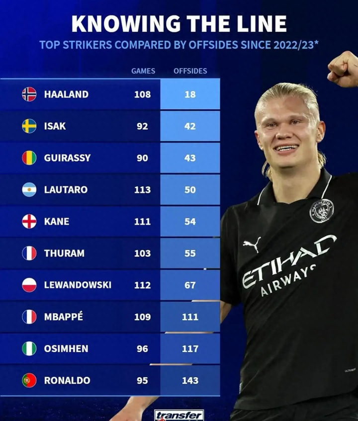 最近,知名数据网站《转会市场》公布了一份榜单:自2022/23赛季以来,各大联赛顶级前锋的越位次数对比。不看不知道,一看才发现——原来每个射手,都在用越位书写自己的风格密码。